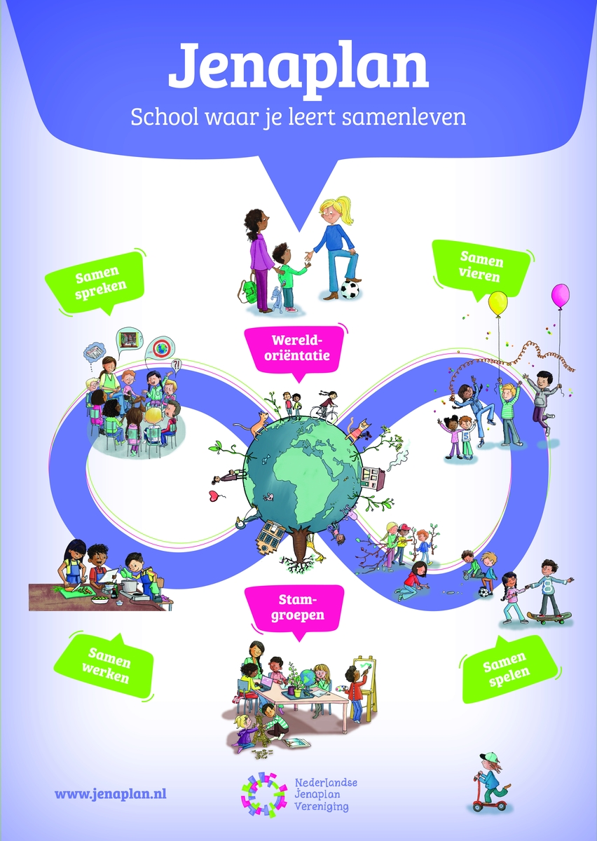 In het jenaplanonderwijs staat het kind centraal. Ieder kind is uniek in zijn ontwikkeling, talenten en leerstijl. In het jenaplanonderwijs krijgen kinderen de ruimte zich zo breed mogelijk te ontwikkelen. Kinderen mogen verschillend zijn. Het doel is dat de kinderen van de verschillen en van elkaar leren en dat ze verschillen leren respecteren. Het jenaplanonderwijs is gericht op de opvoeding van kinderen en omvat daarom veel meer dan het aanleren van de standaard schoolse kennis en vaardigheden als lezen, schrijven en rekenen. Kinderen leren in een jenaplanschool veel door deel te nemen aan de zogenaamde basisactiviteiten, spreken/communiceren, spelen, werken en vieren. De leerstof van een jenaplanschool komt uit de leefwereld van de kinderen en uit het cultuurgoed van de maatschappij.